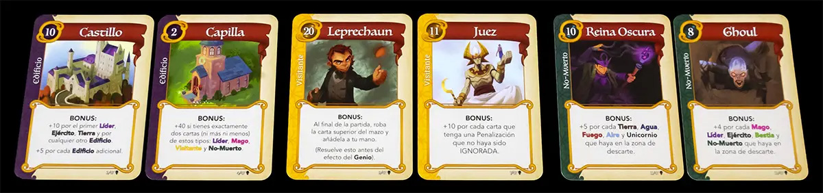 - Tres nuevos tipos de cartas (Edificios, No-Muertos y Visitantes) que se añaden al mazo del juego base y crean nuevas combinaciones.