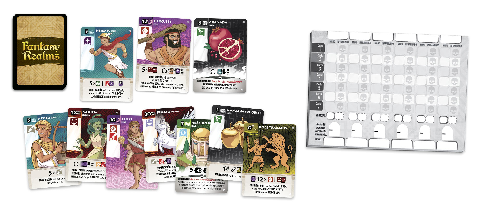¡Este nuevo Fantasy Realms es una versión jugable por si misma que incluye nuevos combos, una puntuación más sencilla de controlar y una nueva mecánica: el Inframundo, que te permite tener un descarte personal que puntuará al final de la partida, aunque cada carta ahí también te restará puntos.