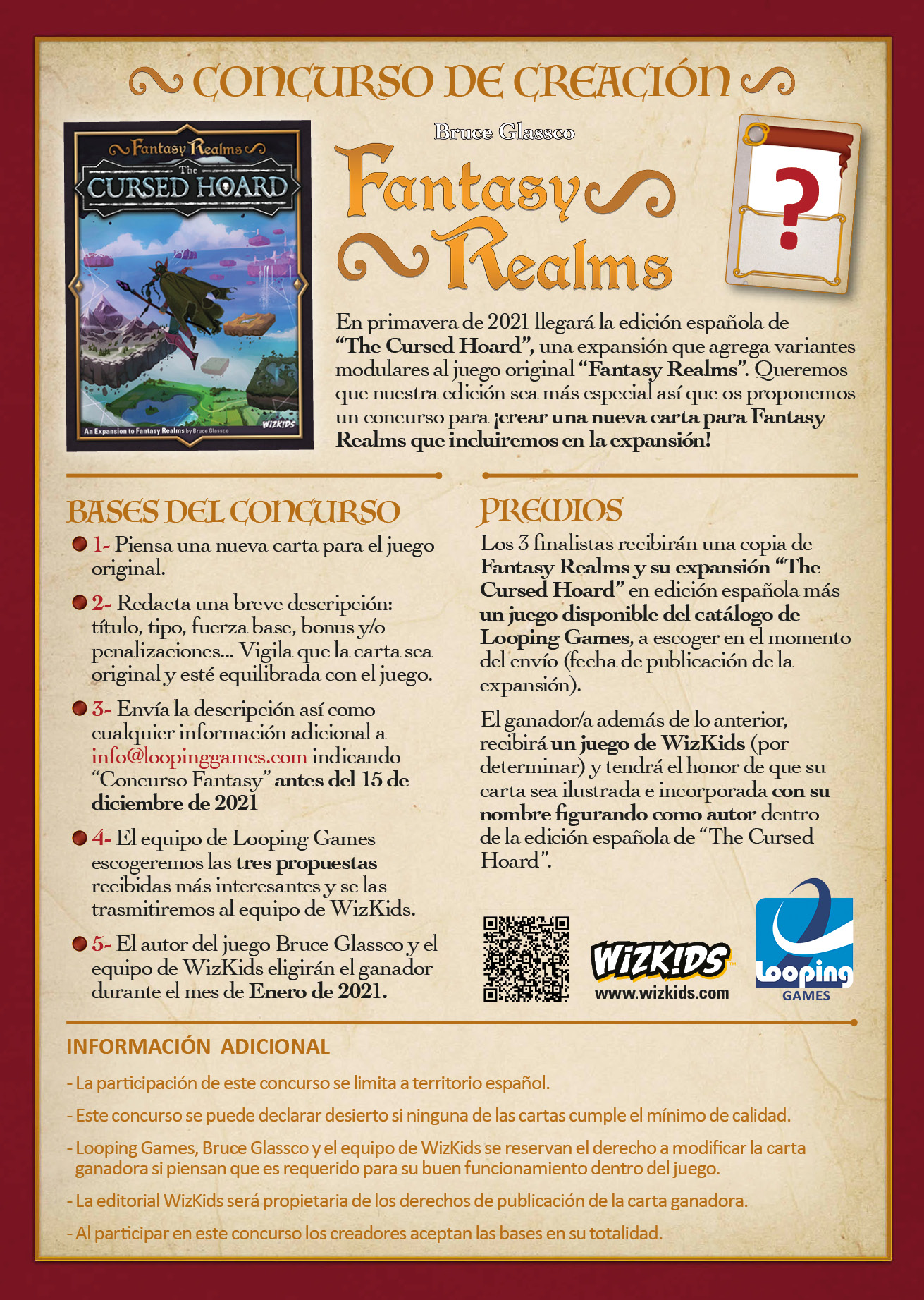 - Los 3 finalistas recibirán una copia de "Fantasy Realms" y su expansión “The Cursed Hoard” en edición española más un juego disponible del catálogo de Looping Games, a escoger en el momento del envío (que será la fecha de publicación de la expansión).